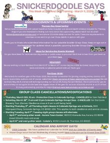 We do our best not to cancel group classes, however, in instances of inclement weather, state traffic advisories or emergencies, trainer illness, and extreme temperatures we will. Generally, 25 degrees F and lower or 95 degrees and higher is unsafe for dogs beyond 10-15 minutes.